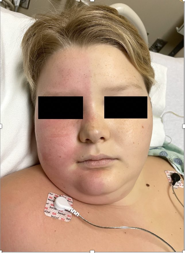 side of the face. Half the face fails to flush during thermal or emotional stress. May also